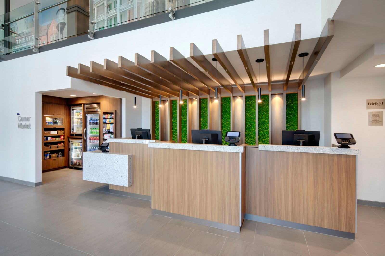 Guestrooms typically require bulk order of one product, whereas public area requires only one product. It’s not uncommon for a company to specialize in one style of production and be unable to offer both bulk and custom orders. However, we offer both quantifiable and singular production so you can order all your hotel products from us. Shop from our existing inventory or create a custom piece. A hotel public area makes a guests’ first impression. It’s crucial to make it something they’ll never forget with a stunning custom design such as our millwork featured behind the front desk at this Fairfield Inn in Franklin, TN.